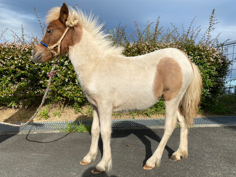 【馬名】 アン 【生年月日】 2022/03/15 【性別】 メス 【毛色】 駮栗毛 【体高】 78cm ※2022年8月現在 【性格】 やや臆病。 【販売価格】 ¥640,000